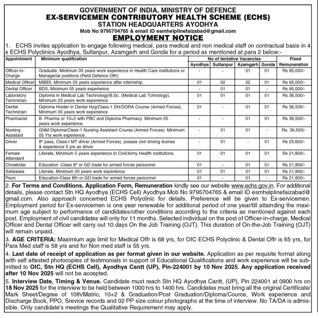 Job Information: ECHS Ayodhya invites applications for the post of Medical and Non-Medical staff from eligible candidates through offline medium in ECHS Polyclinic Ayodhya, Sultanpur, Azamgarh, Gonda for a period of 11 months / 01 year, renewable for an additional period of one year / till attaining the maximum age, subject to the performance of candidates, according to the criteria against each post under ECHS Ayodhya recruitment 2025.