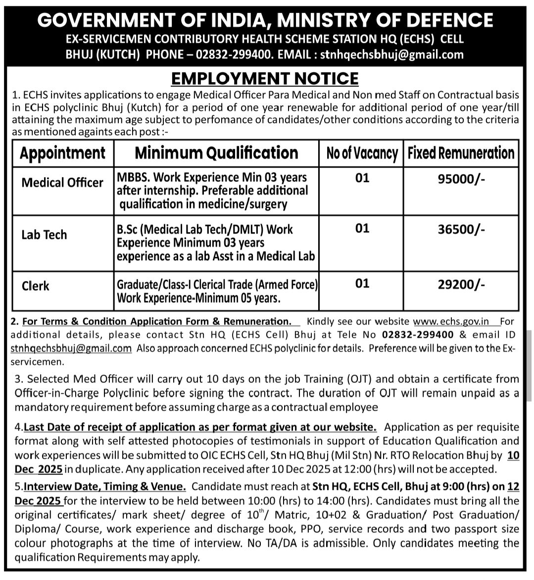 Nationality, Contact Number, along with attested copies of relevant certificates/documents, should reach the office of the Officer-In-Charge, Station Headquarters (ECHS Cell), Bhuj, in Triplicate either by registered post or by hand, well before the closing date, i.e., 10 December 2025. Applications received through e-mail shall not be entertained.