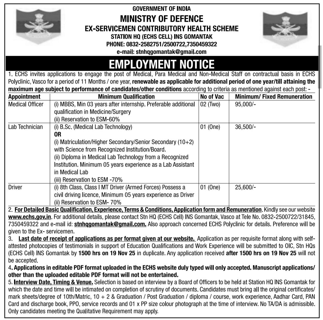Job Information: ECHS INS Gomantak invites applications for the post of Medical and Non-Medical staff from eligible candidates through offline medium in ECHS Polyclinic Vasco (Goa) for a period of 11 months / 01 year, renewable for an additional period of one year / till attaining the maximum age, subject to the performance of candidates, according to the criteria against each post under ECHS INS Gomantak recruitment 2025.