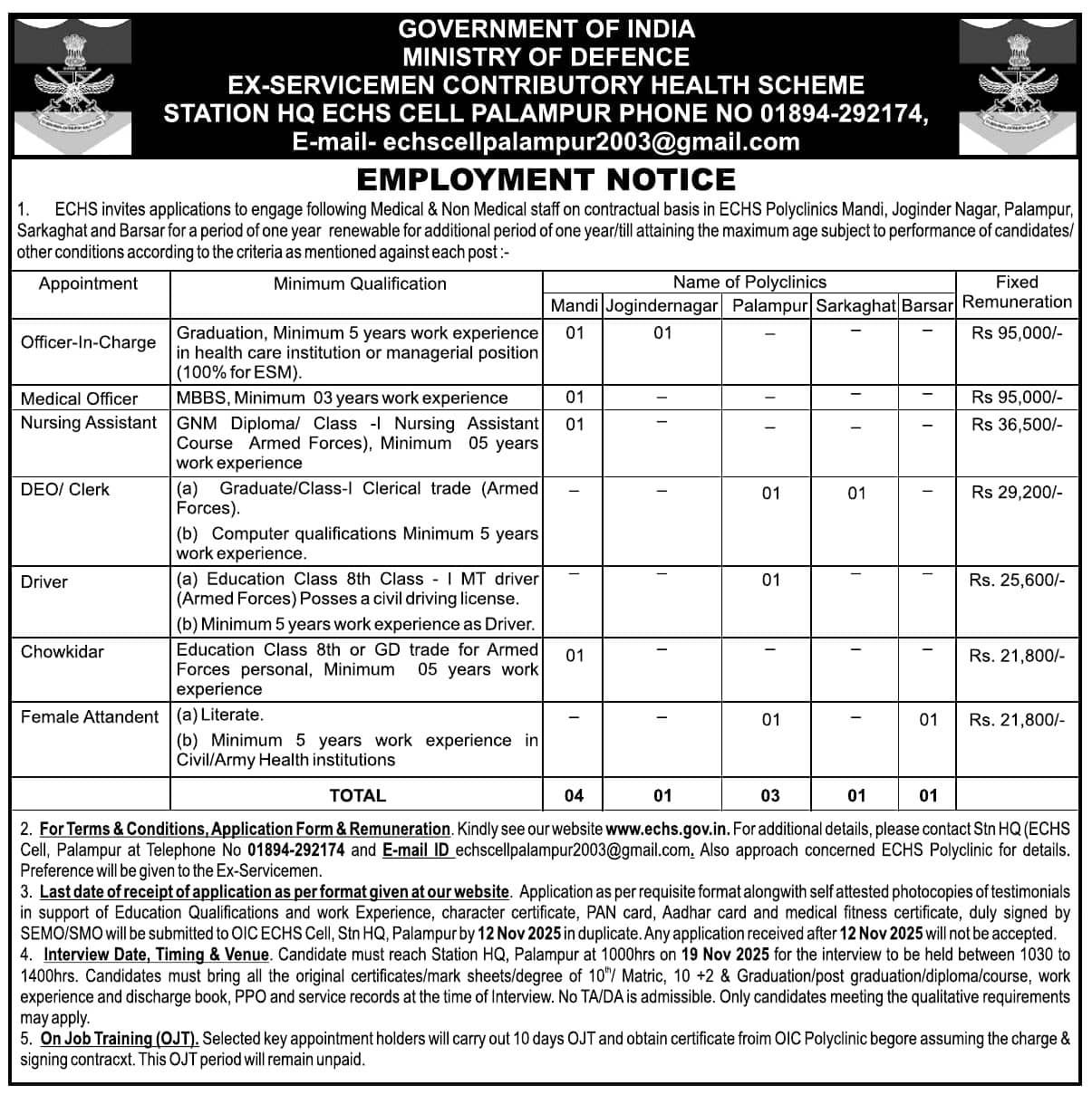Job Information: ECHS Palampur invites applications for the post of Medical and Non-Medical staff from eligible candidates through offline medium in ECHS Polyclinic Mandi, Jogindernagar, Palampur, Sarkaghat and Barsar for a period of 11 months / 01 year, renewable for an additional period of one year / till attaining the maximum age, subject to the performance of candidates, according to the criteria against each post under ECHS Palampur recruitment 2025.